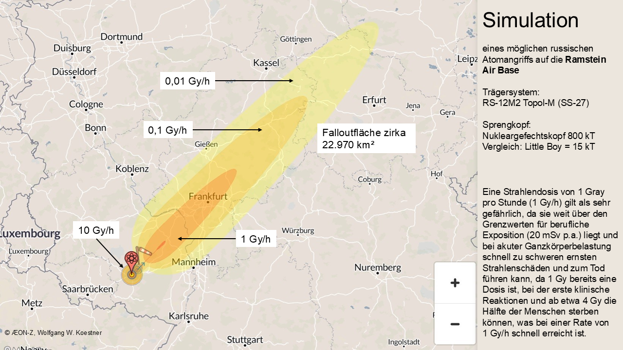 Bei vergleichbarer Bevölkerungsdichte und Infrastruktur wären pro Ziel realistisch mit 80000 bis 150000 Sofort-Toten (Ramstein/Büchel wegen dichter Besiedlung besonders hoch) sowie Zehntausenden von Verletzten zu rechnen. Würden diese drei militärischen Ziele konkret getroffen müssten innerhalb weniger Stunden zwischen 250000 und 400000 Tote beklagt werden. Langfristig dürften weitere zehn bis 20 Prozent der kontaminierten Menschen durch Strahlenfolgen sterben.